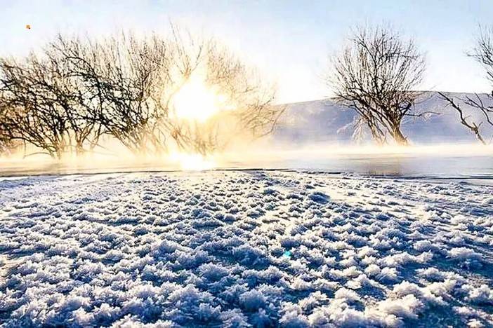 河谷中的树木挂满晶莹的雾凇,在晨光中如同披着银甲的魔幻军团。蜿蜒的河道被冰雪覆盖,形成奇特的雪廊,越野车将如孤勇的探险家,率先碾过无人踏足的雪原,驶入这个静谧而诡异的冰封世界。