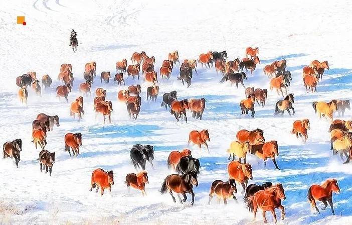 奔驰的骏马,驰骋在皑皑白雪的大草原,